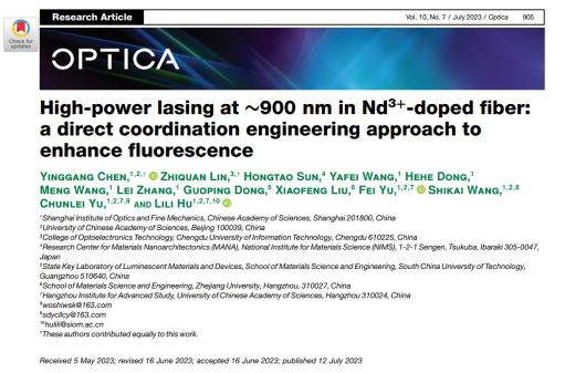 【本网讯】近期,光电工程学院林治全博士与中国科学院上海光学精密机械研究所在900nm激光方面开展合作研究并取得重要进展,研究成果以“High-power lasing at ~900 nm in Nd3+-doped fiber: a direct coordination engineering approach to enhance fluorescence”为题发表于光学顶级期刊Optica(JCR一区,IF:10.4),并被选为封面。林治全博士为共同第一作者。