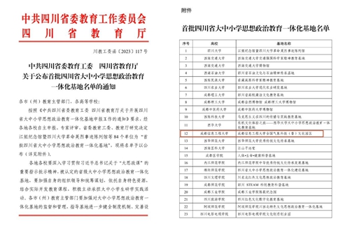 【本网讯】日前,中共四川省委教育工委、四川省教育厅公布了首批四川省大中小学思想政治教育一体化基地名单。各地各校自主申报、专家评审,省委教育工委、教育厅此次批准了84个单位为“首批四川省大中小学思想政治教育一体化基地”。我校电子工程学院以全国气象科技(普)文化园区为依托进行申报,此次获批四川省首批大中小学思想政治教育一体化基地。