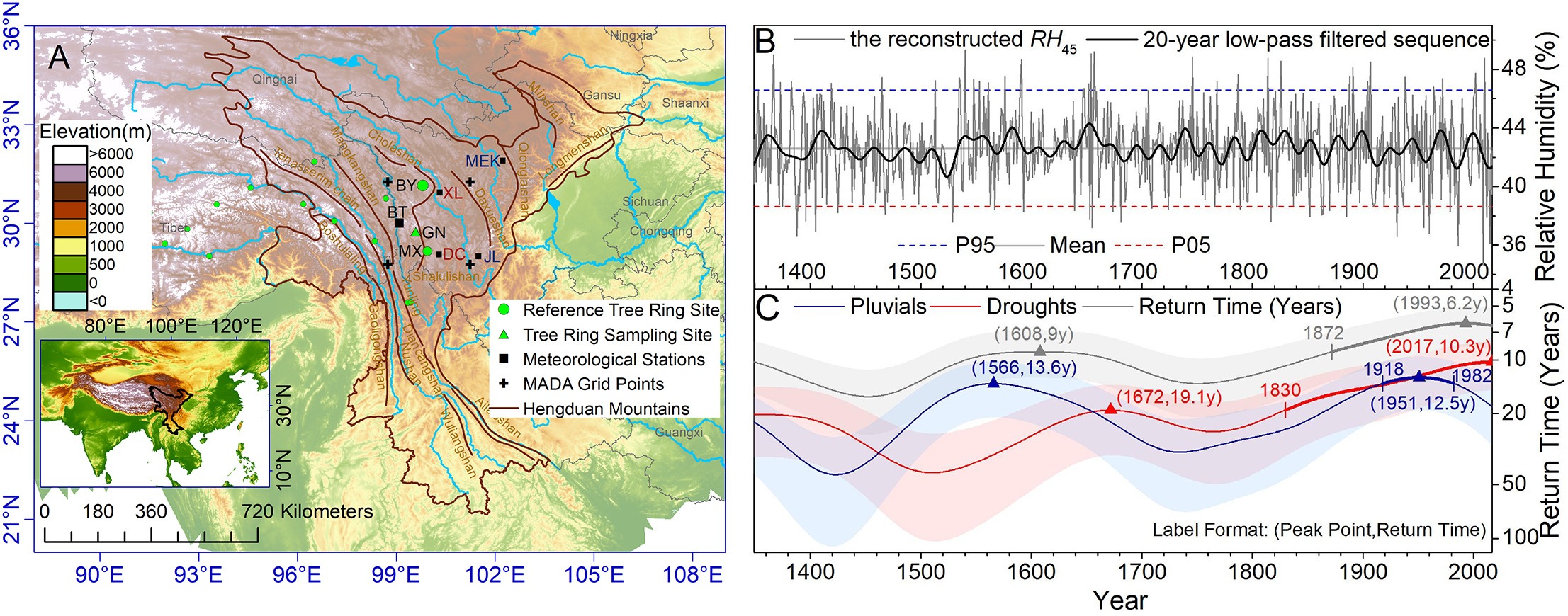 树轮采样点信息(A)、重建1349-2017年相对湿度变化(B)以及极端降雨事件(蓝线)、干旱事件(红线)和所有干、湿极端事件(灰线)的重现期及相应的置信区间(C)(图片摘自Cuiet al., 2024)