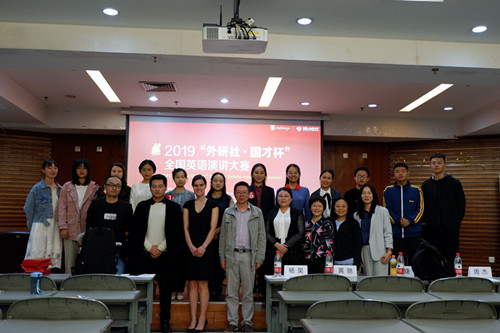 【本网讯】2019"外研社·国才杯"全国英语演讲大赛(环球官方初赛)于2019年10月9日晚19:00在学校航空港校区学术报告厅顺利举行。本次比赛由外语教学与研究出版社主办,由我校教务处和外国语学院承办,外语俱乐部协办。外国语学院党总支书记杨昊、院长黄驰、副院长卢婕作为嘉宾出席大赛,副院长周杰、外国语学院教师吴玉华、邓圆、吴倩、外教Wilbur和Ashley担任此次大赛评委。