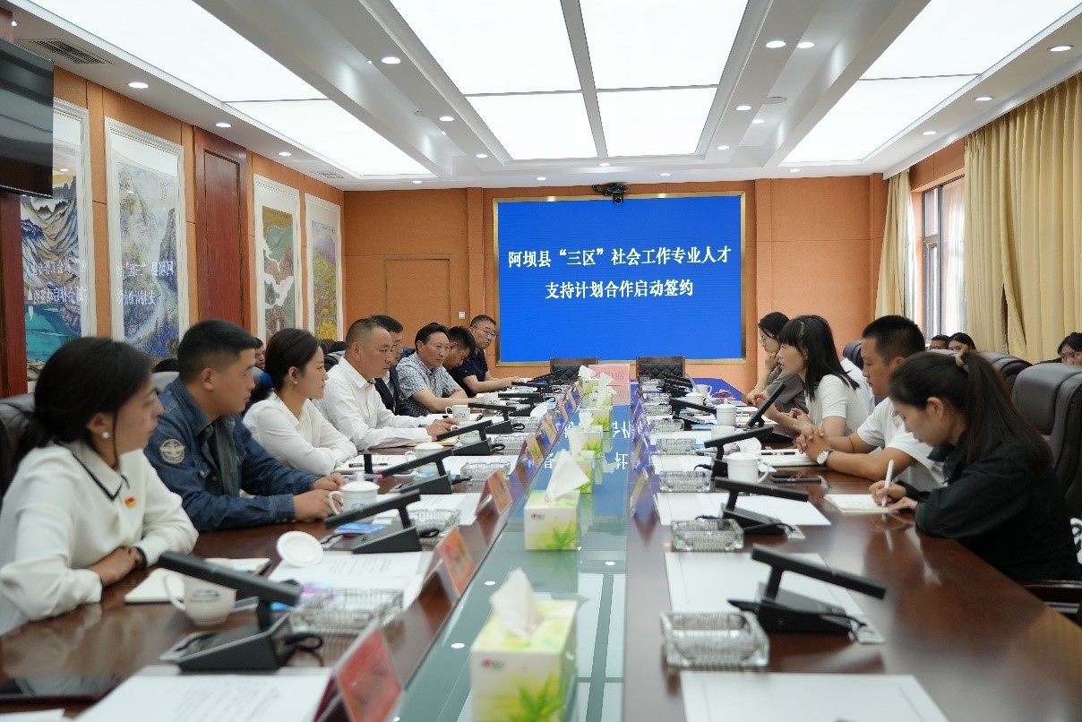 8月29日上午,在阿坝县委社会工作部的支持下,环球官方社会工作服务团队与成都市同行社会工作服务中心,在阿坝县举行“三区”社会工作专业人才支持计划合作签约仪式,阿坝县委常委、政法委书记、县委社会工作部部长彭光明参加签约仪式,签约仪式上,彭光明书记代表县委社会工作部做了发言,随后我校伍娟副教授进行发言。