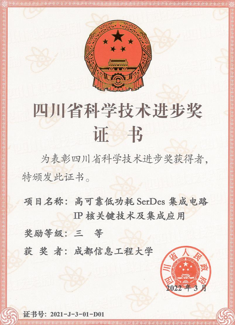 四川省科学技术进步奖三等奖证书